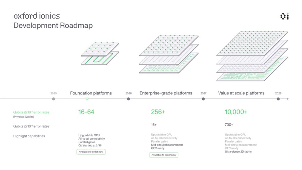 Společnost Oxford Ionics představila třífázovou vývojovou roadmapu (viz níže) zaměřenou na vývoj škálovatelných kvantových počítačů odolných vůči chybám s cílem dosáhnout systémů s více než milionem qubitů na bázi uvězněných iontů. Jejich přístup kombinuje technologii zachycených iontů s patentovanou technologií elektronického řízení qubitů (Electronic Qubit Control, EQC), která umožňuje integraci kvantových procesorů do standardních polovodičových výrobních procesů. Tato kombinace slibuje vysoký výkon a škálovatelnost. Společnost plánuje postupné zvyšování počtu qubitů a zlepšování jejich koherence a spolehlivosti, což by mělo vést k vytvoření kvantových systémů schopných řešit komplexní výpočetní úlohy v různých oblastech, včetně chemie, logistiky a financí.
