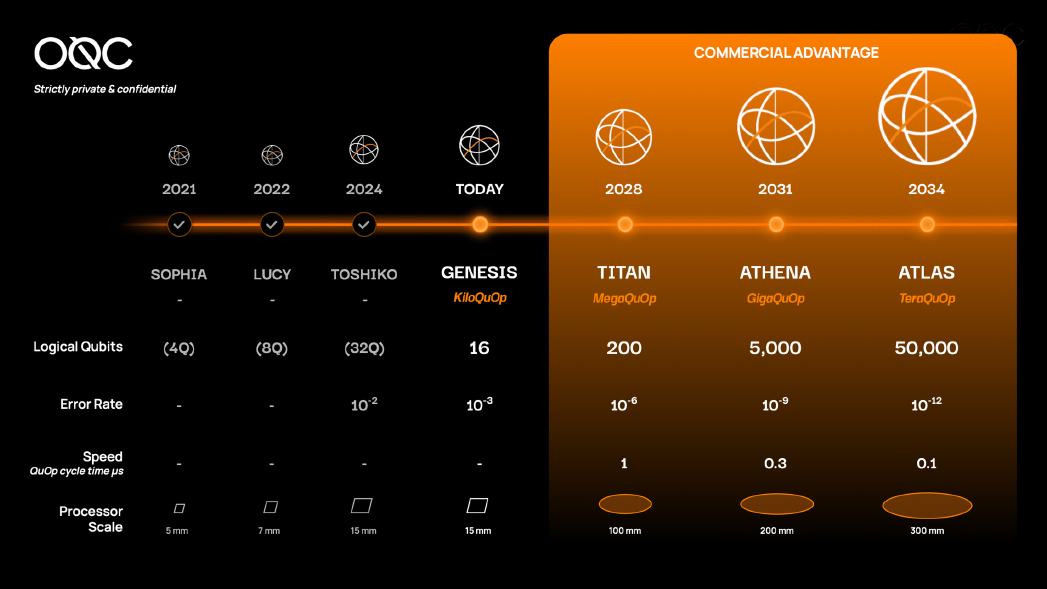 Oxford Quantum Circuits (OQC) zveřejnila devítiletou technologickou roadmapu směřující k 50 000 logickým qubitům v systému „Atlas“ do roku 2034. Plán předchází třemi klíčovými etapami: Genesis (2026) s 16 logickými qubity a chybovostí 10⁻³ na 15 mm čipu, nasleduje Titan (2028) s 200 logickými qubity, chybovostí 10⁻⁶, 1 MHz cyklovou rychlostí a 100 mm waferem, a Athena (202?–2030) se 5 000 logickými qubity při 10⁻⁹ chybovosti na 200 mm waferu. Pro klíčovou efektivitu využívají supravodivé „multi-mode dual‑rail Dimon“ qubity, které snižují poměr fyzických k logickým qubitům ~10×. Titan již operuje s dvouqubitovou CZ branou s fidelitou 99,8 %, zatímco Atlas má dva 300 mm wafery s cílovou logickou chybovostí 10⁻¹² a frekvencí 10 MHz.