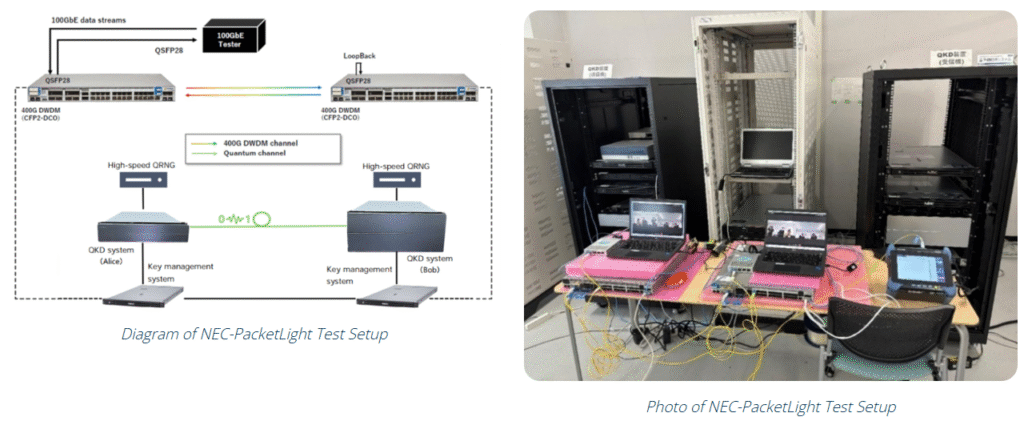 PacketLight Networks společně s NEC Corporation úspěšně předvedly kvantovou distribuci klíče (QKD) vedle existujícího 400 Gb/s DWDM přenosu optickým vláknem v NEC laboratořích v Japonsku. Demonstrace využila systém NEC pro QKD a PacketLightův PL‑4000M 600 G Muxponder, přičemž kvantový kanál běžel paralelně v odděleném vlákně vedle hlavního DWDM provozu. Díky tomu byla zajištěna 100% propustnost klasického přenosu bez dopadu na latenci, zatímco QKD běžel s nízkým zpožděním bez interference. Tento přístup ukazuje, že quantum-safe šifrování klíčů lze integrovat do existujících vysokorychlostních sítí bez výměny infrastruktury, čímž vzniká praktická a škálovatelná cesta pro nasazení QKD v reálných operativních prostředích